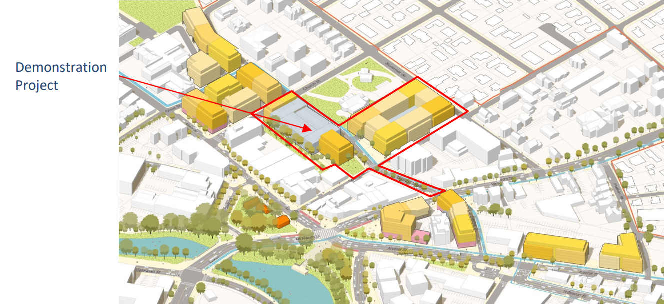 The area that the Demonstration Project focused on is the public parking lot behind CVS near Watertown Square and a series of the surrounding parcels between Spring Street, Summer Street, and Church Street. We encourage those interested to watch the presentation given by City Manager George Proakis on April 6, 2026, introducing the plan and giving a detailed overview of what is possible in that area of the Square.