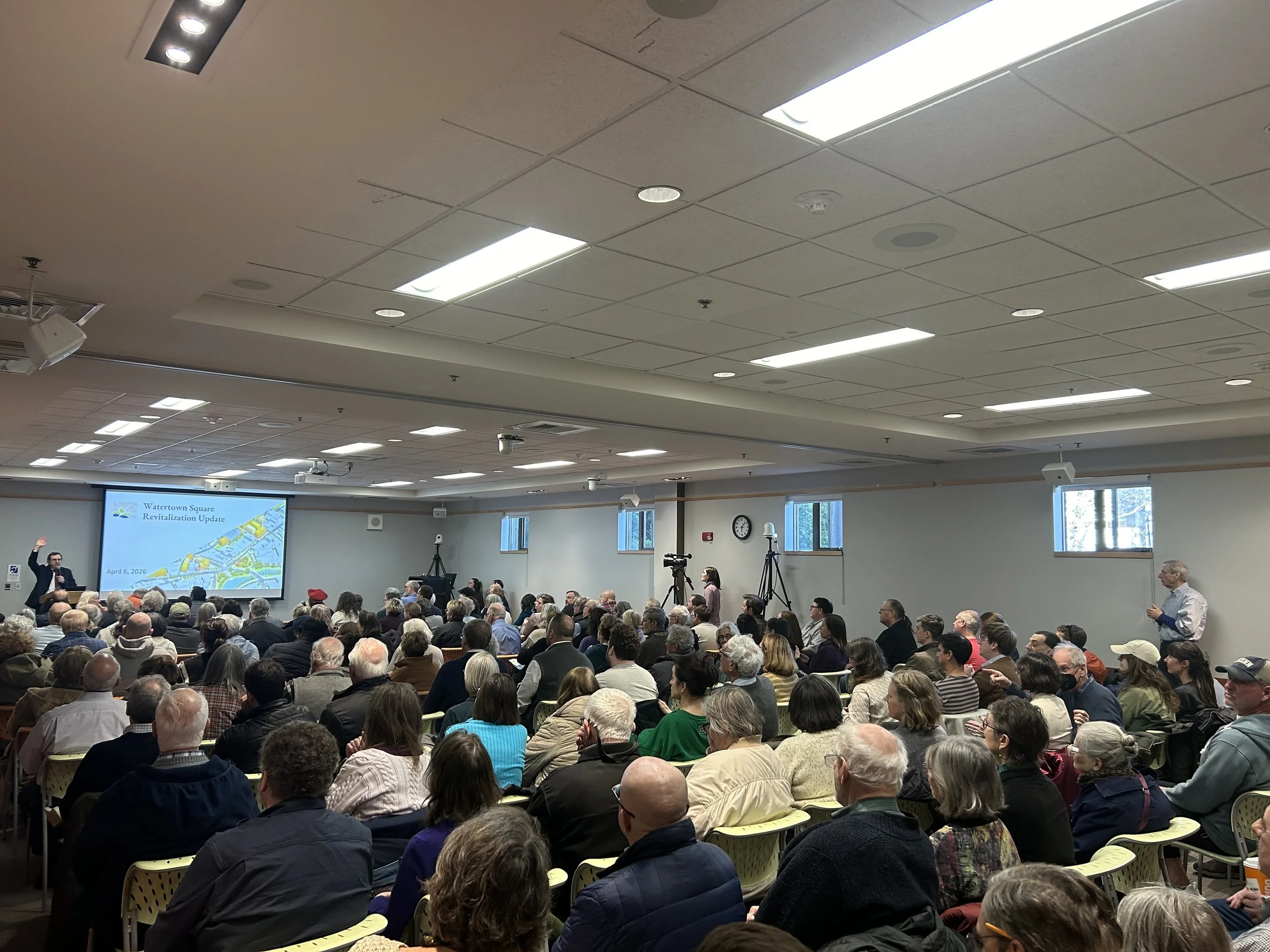 The City of Watertown hosted a full house at the Watertown Free Public Library on Monday night, April 6, 2026, for City Manager George Proakis's presentation updating the community about the implementation of the Watertown Square Area Plan. City Manager Proakis touched on a number of topics, including the streetscape project that has recently gotten underway, the recent development projects that have been spurred in the aftermath of the new zoning passed in November 2024, and a detailed introduction into the Demonstration Project Plan - potential strategies for the community to consider regarding some key areas within the Square.